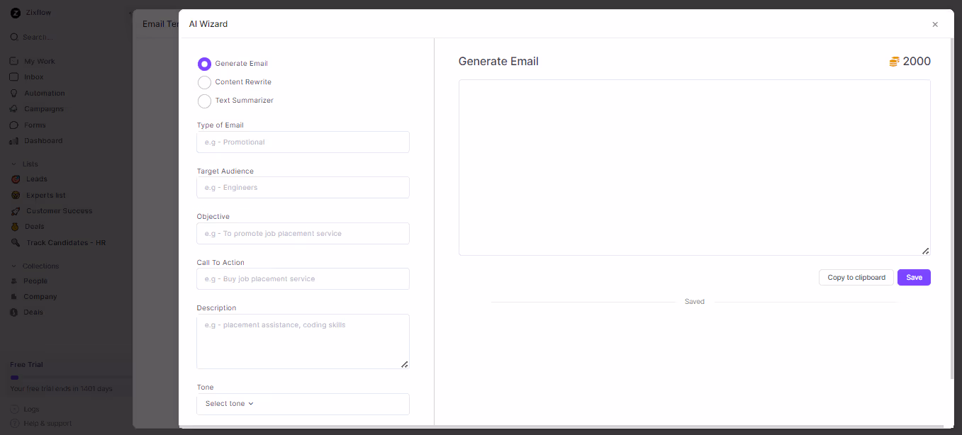 This tool allows you to design visually appealing and responsive emails without needing any coding skills. You can easily drag and drop elements, images, and text to create professional-looking emails. Also, you can easily generate emails through its AI wizard.
