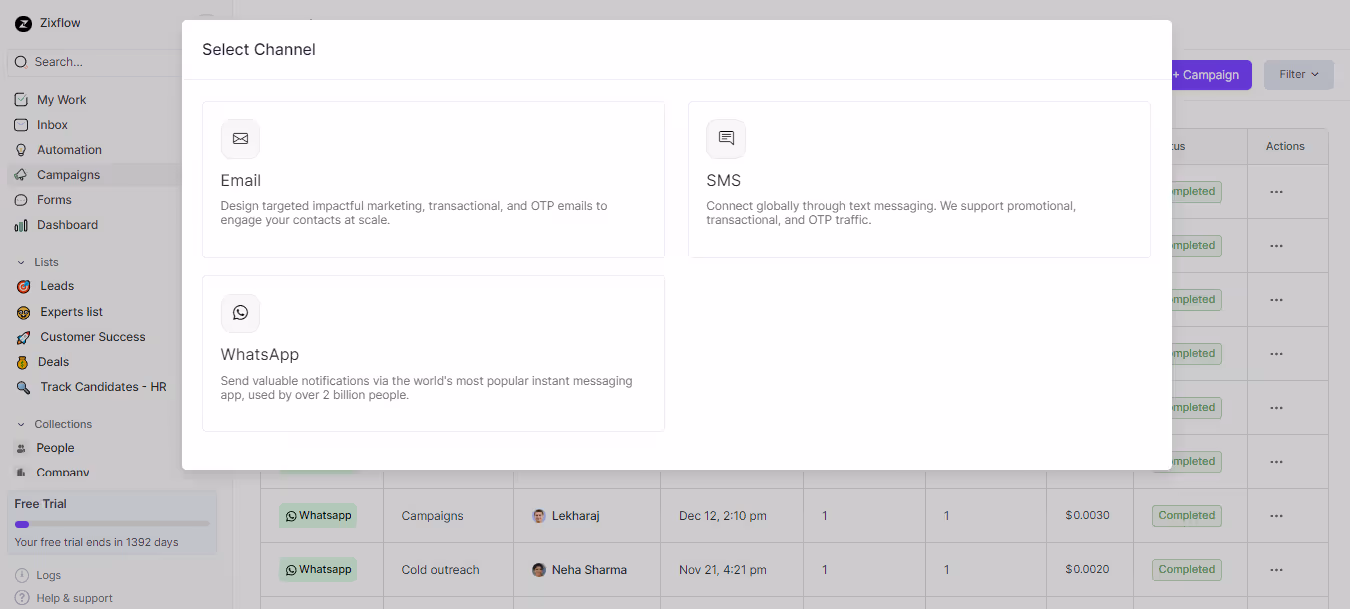 As Zixflow is an omni-channel platform, you can create and send targeted email marketing campaigns, SMS, and WhatsApp campaigns to your customers and leads. You get to segment your audience and track your campaign results.