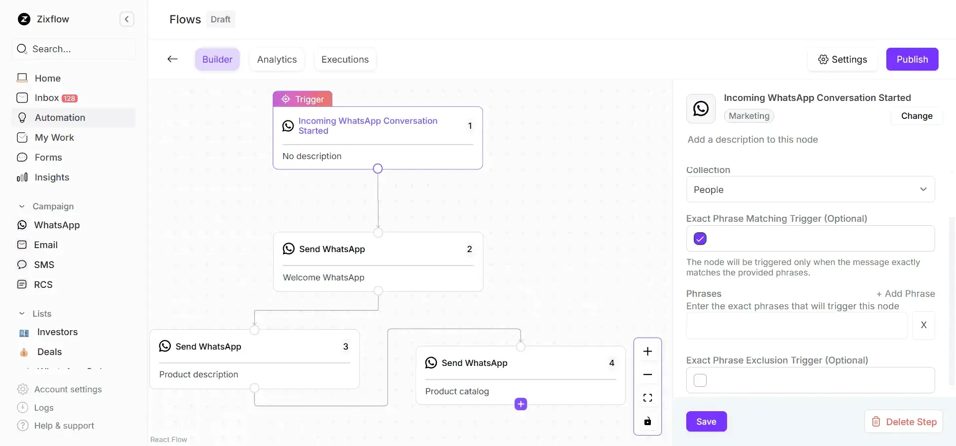 Marketers can choose the channels and the messages to design an automated flow that triggers based on predetermined conditions. For example, if a customer interacts with your business and provides their phone number, you can trigger a WhatsApp messaging flow using the platform to interact with them to keep them interested in your offerings.