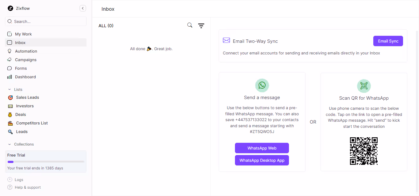 Zixflow is an advanced marketing platform that lets you run omnichannel marketing campaigns across SMS, email, and WhatsApp. You can set up an outreach campaign in a matter of minutes with a visual campaign builder and start sending messages at scale.