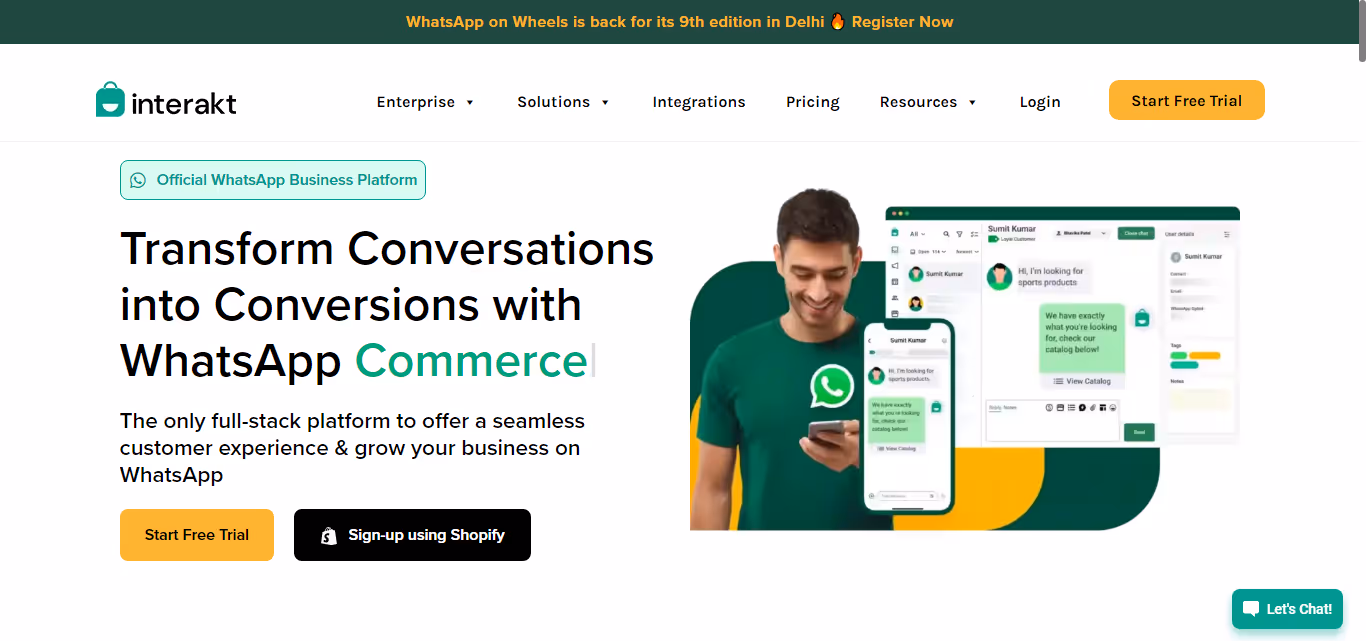 Interakt lets you manage all of your WhatsApp marketing activities using a single phone number. You can use it to run marketing campaigns, reach out in case of a problem, offer specialized discounts, and convert leads around the clock.
