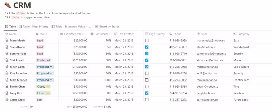 Notion is much more of a project management tool than a full-fledged CRM platform. However, you can still use it to manage contacts using templates where you can create your own CRM to accommodate various kinds of details.