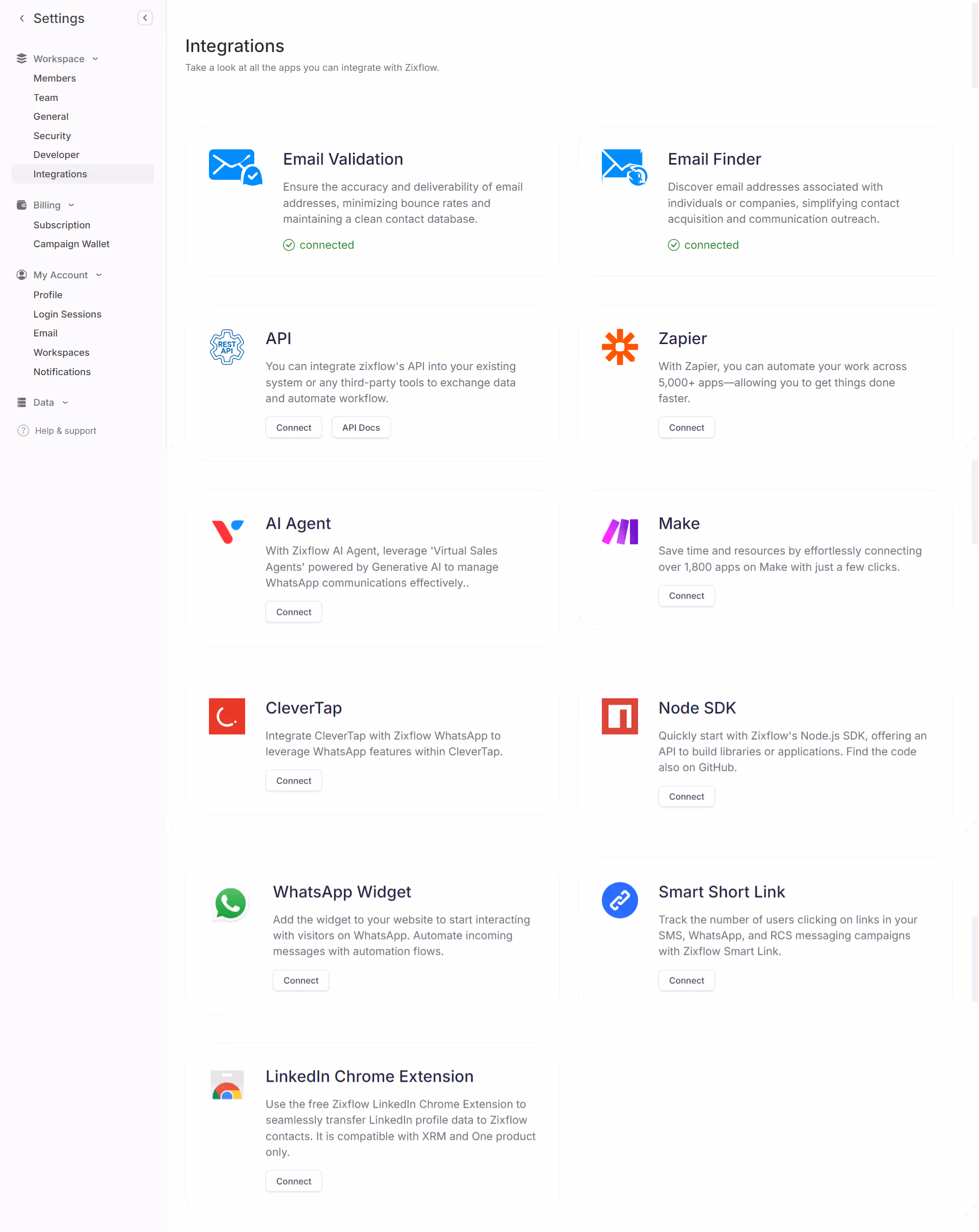 Furthermore, to help you get started with APIs and webhooks, Zixflow provides in-depth API docs. By going through this documentation, you can set up custom integrations across thousands of platforms by utilizing app marketplaces like Zapier or Make for quick importing of customer data from multiple data sources.
