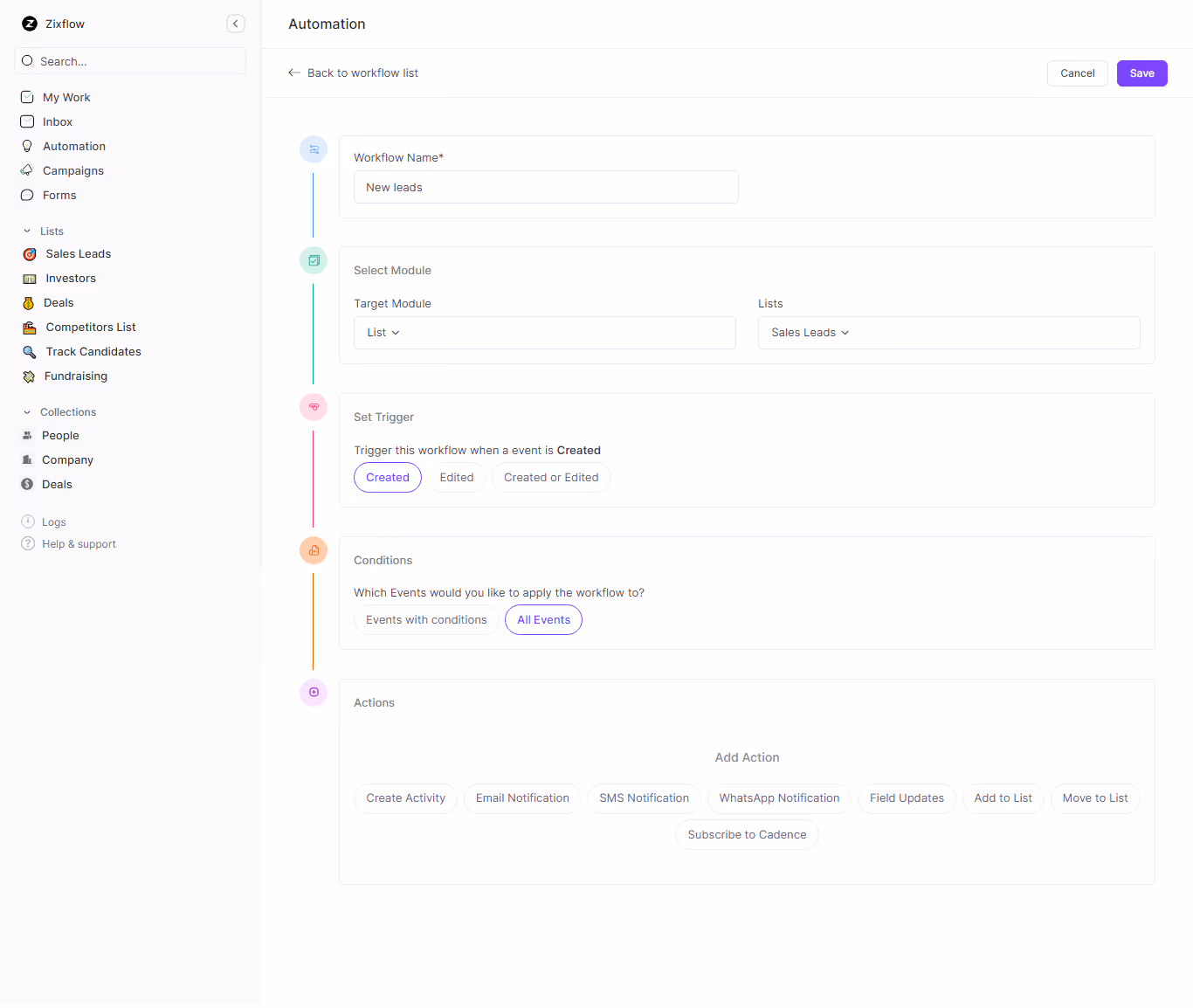 You can automate your workflow, like client follow-ups, sending email reminders, and scheduling calls with Zixflow workflow automation. This way, you can streamline your lending process and eliminate repetitive tasks from your everyday schedule.