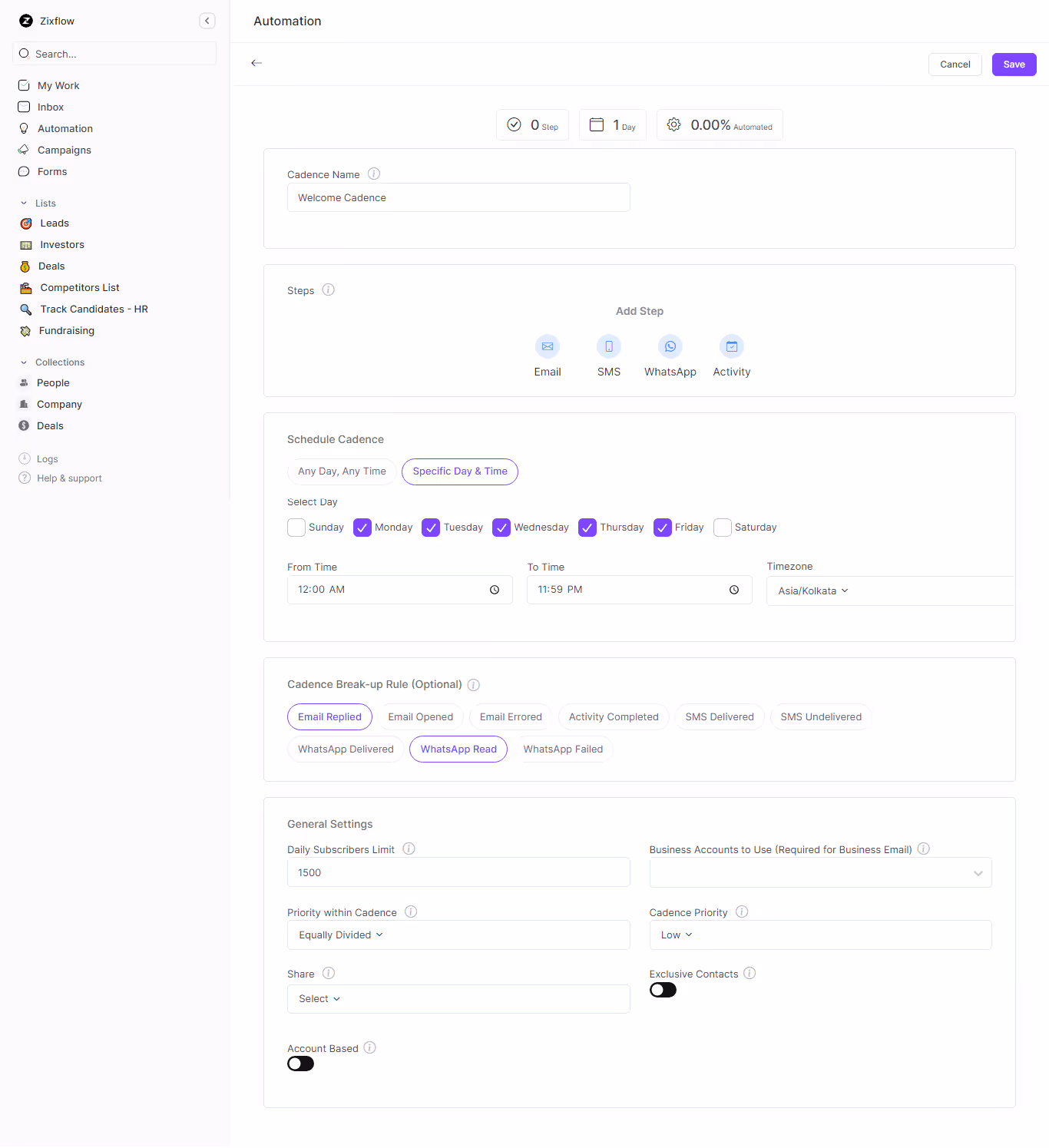 Zixflow allows you to set up cadences to boost your sales efficiency and automate your outreach. By leveraging the sales cadence templates, you can speed up your sales process.