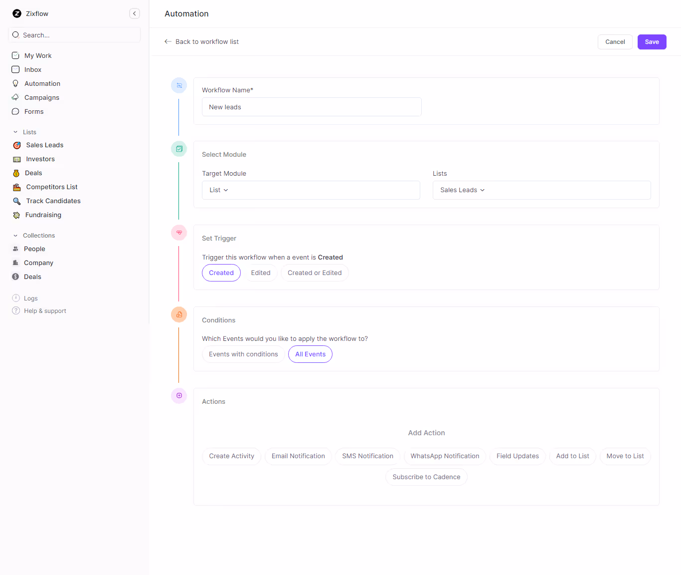 Another automation functionality of Zixflow is to create workflow automation. With these automated workflows, you can get rid of redundant sales tasks and free up valuable time for your teams.