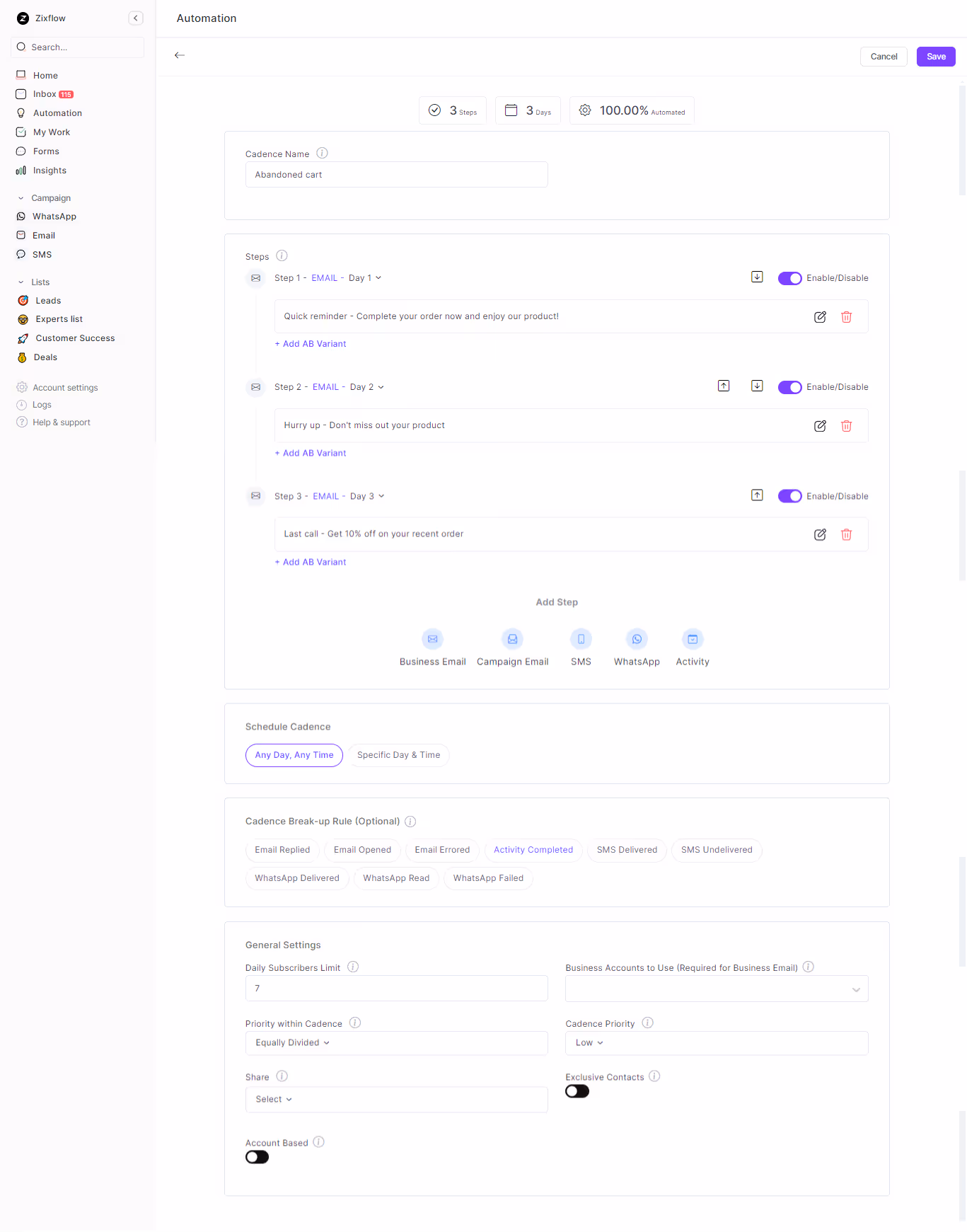 With Zixflow’s omnichannel features, you can connect with your customers on their favorite channels, like email, SMS, or WhatsApp. Using its workflow automation feature like sales cadence, you can create cart abandonment email sequences to re-engage your customers. You can also create emails using the AI wizard, just enter the necessary information, and the AI will generate the email for you and a drag-and-drop email builder will help you make emails easily.