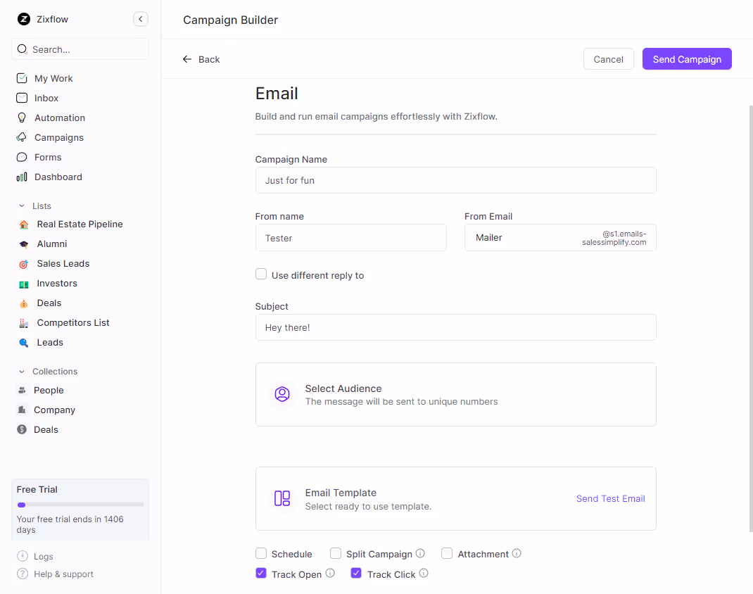 Zixflow has a comprehensive campaign builder for your email campaigns. With the email drafts easily made by Zixflow AI, all you need to do is use the Zixflow campaign builder to start sending emails. The intuitive drag-and-drop campaign builder makes designing extremely easy. With this working at maximum efficiency and minimal effort, you can easily get the maximum ROI in your marketing efforts with Zixflow.