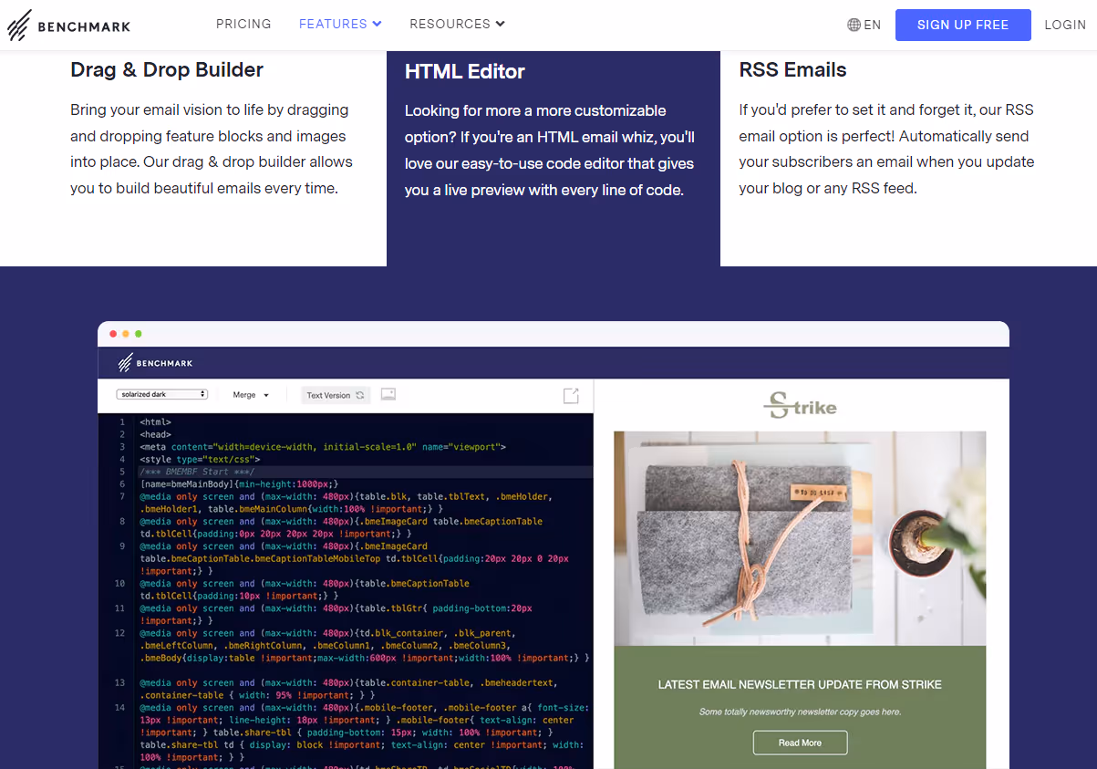 Benchmark offers a comprehensive email builder that suits your workflow. It does so by offering three ways to build your emails: a drag-and-drop builder, an HTML editor, and RSS emails that automate all processes.