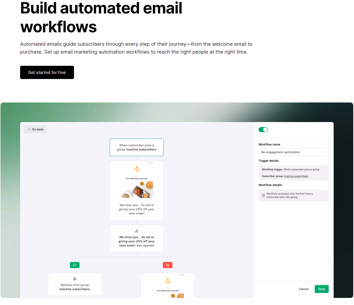 The marketing automation feature helps you run your whole marketing efforts on autopilot. You use this feature to set custom triggers and actions. This can help you stay away from continuously working away to send emails, you can simply set a trigger to send emails after a user performs an action. This can help with cart abandonment, lead scoring, reminder and follow-up emails, and more.