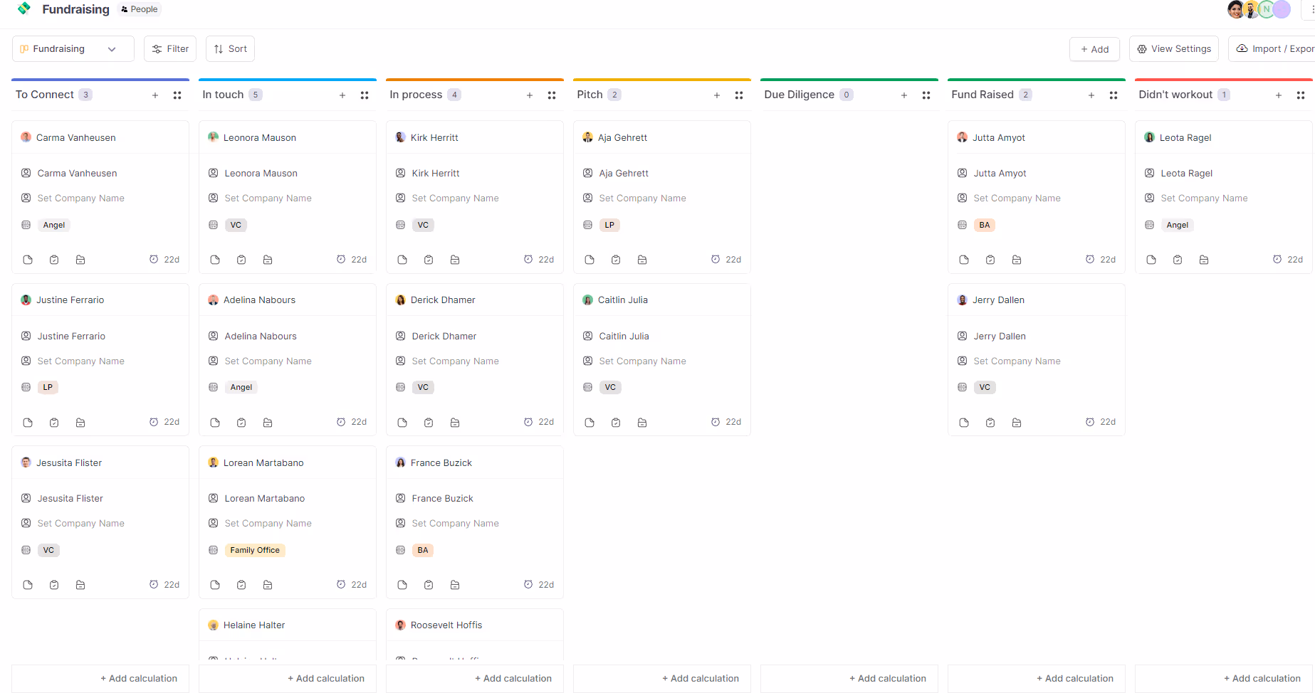 You can easily change what you see with custom fields like Investor name, type, amount invested, preferred industry, invested industry, and many more.