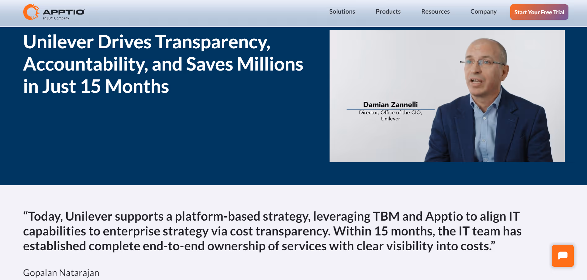 For instance, you can see here that Apptio, an IBM company not only shared detailed data on the web but also shared a video with the director of Unilever which is IBM’s partnered company. The purpose is here to showcase how IBM dug out the core problems in Unilever, how to strategize to save Unilever millions of cost in 15 months by solving problems from the root, and most importantly how IBM gained Unilever’s advocacy.