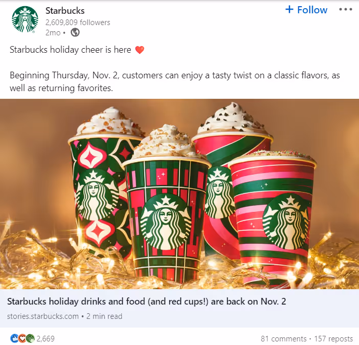 Firstly, you can see that one of the leading beverage brands Starbucks is always using the LinkedIn platform. Before launching its next classic flavors to twist the taste buds of its customers, Starbucks announced the latest upcoming products. The reason behind this is that Starbuck can keep the curiosity and easily deal with the help of sales psychology while influencing its customers' buying decisions.