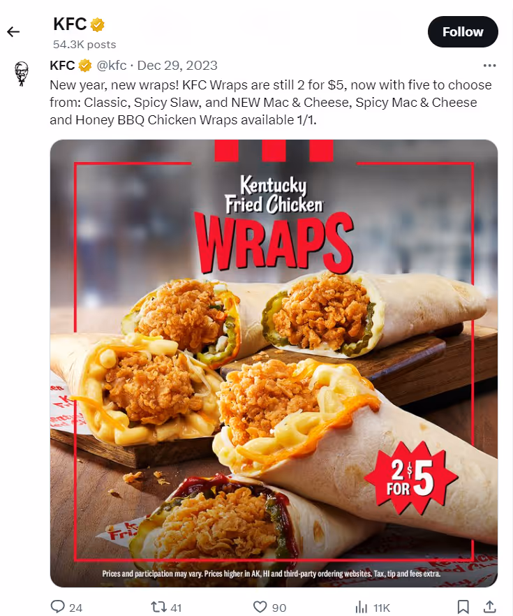 Well, the next example is from a brand that you may have also found mouthwatering. This is none other than KFC, which is popular for its delicious chicken burgers, chicken nuggets, fried chicken, and so much more. It already knows how people crave fast foods and when it’s a New Year party, how KFC can move behind. It simply proposes the deal on its Twitter account, highlighting KFC wraps of 2 still at $5.