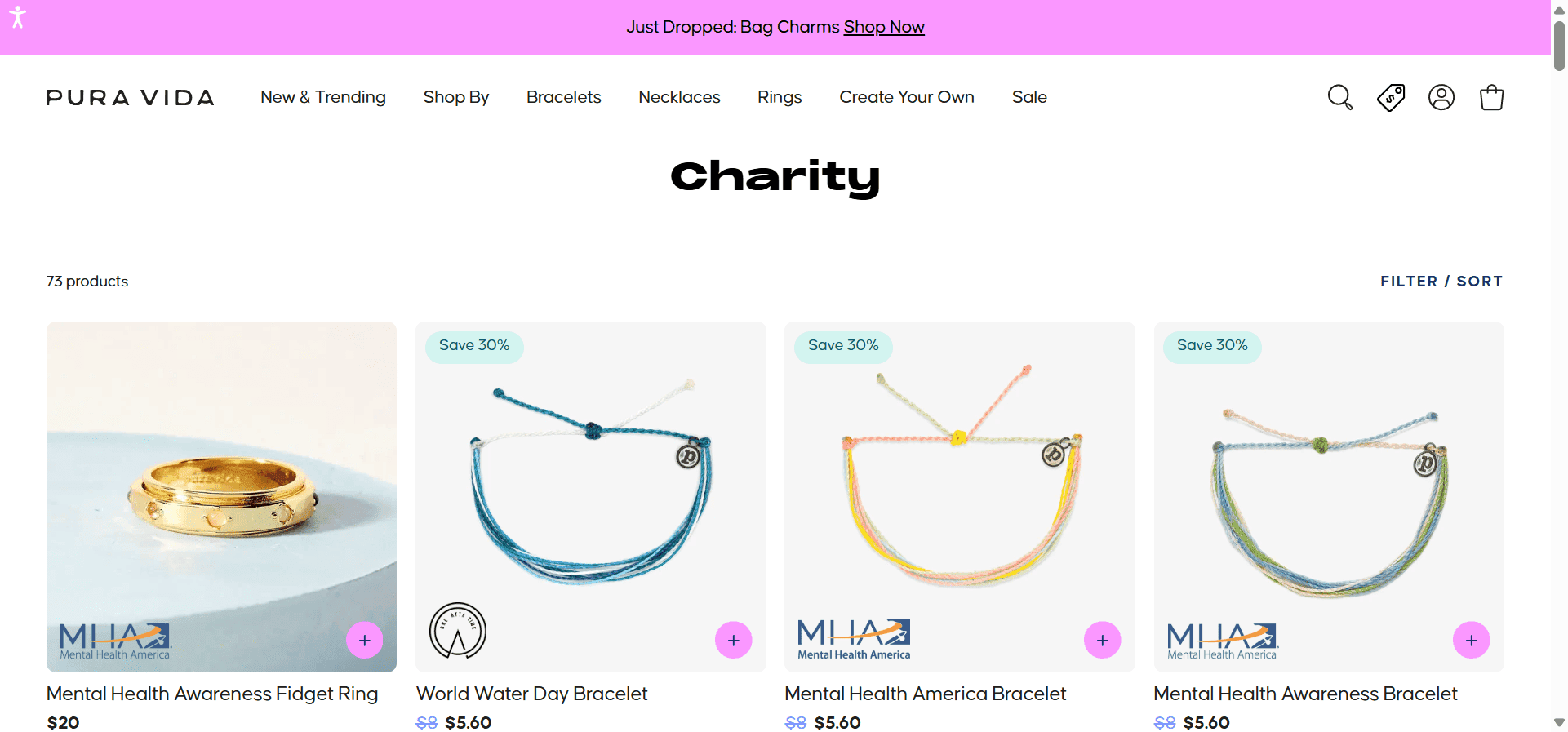 Pura Vida Bracelets is a brand that makes jewelry. They have a monthly program called "Charity Collection," where customers can earn points when they buy things or share on social media. They also hold regular giveaways to encourage people to come back and build a community.
