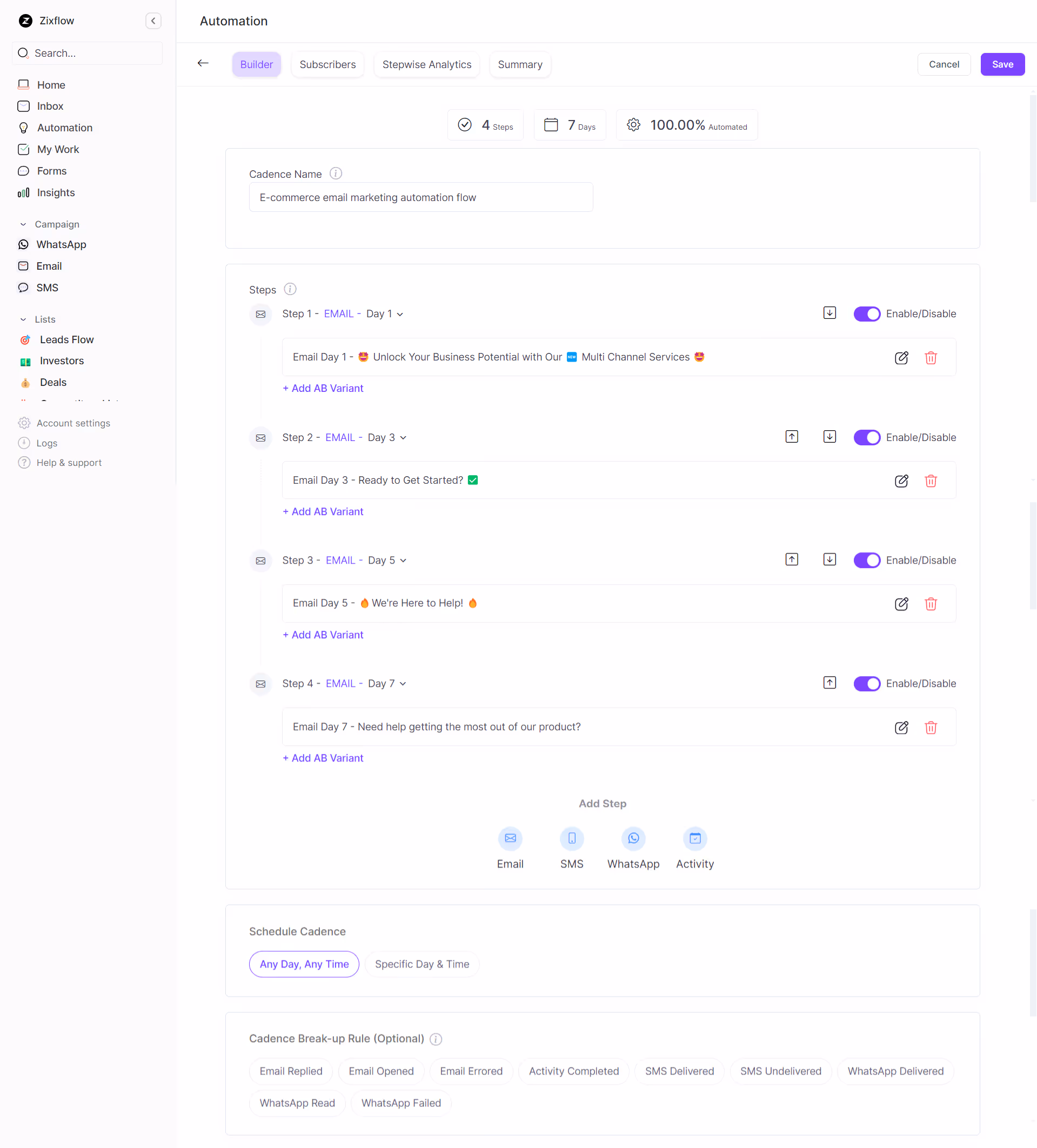 With Zixflow’s sales cadences, you can craft custom e-commerce email marketing flows to incorporate the above-mentioned flows into your overall marketing strategy.