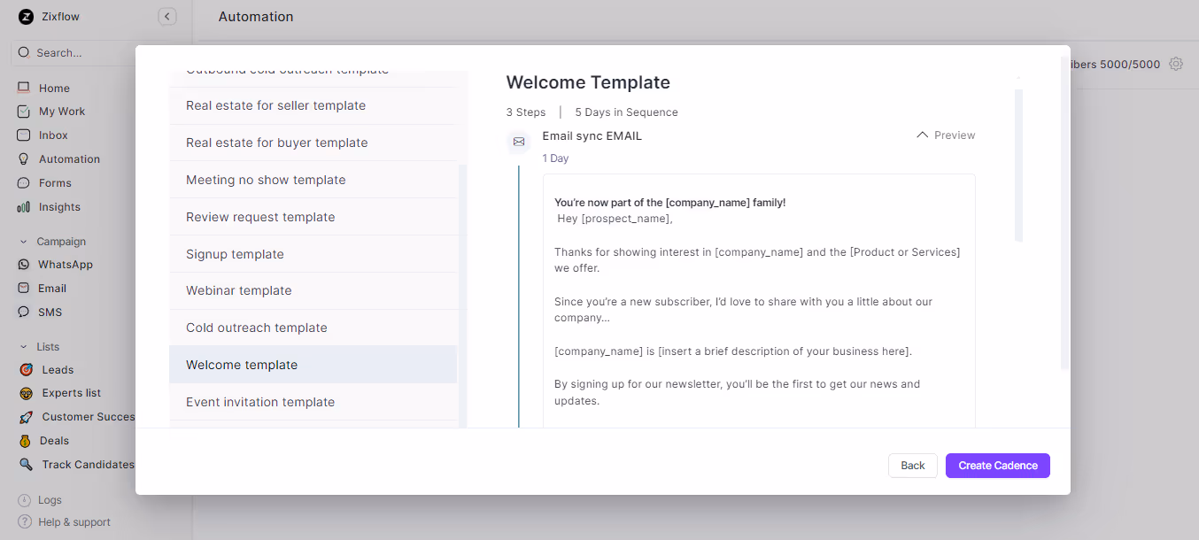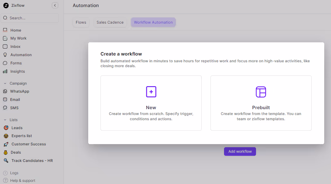 With Zixflow’s automation feature, you can implement sales cadences with three options: new, prebuilt, and clone. If you’re short on time, the prebuilt template is available for quick use