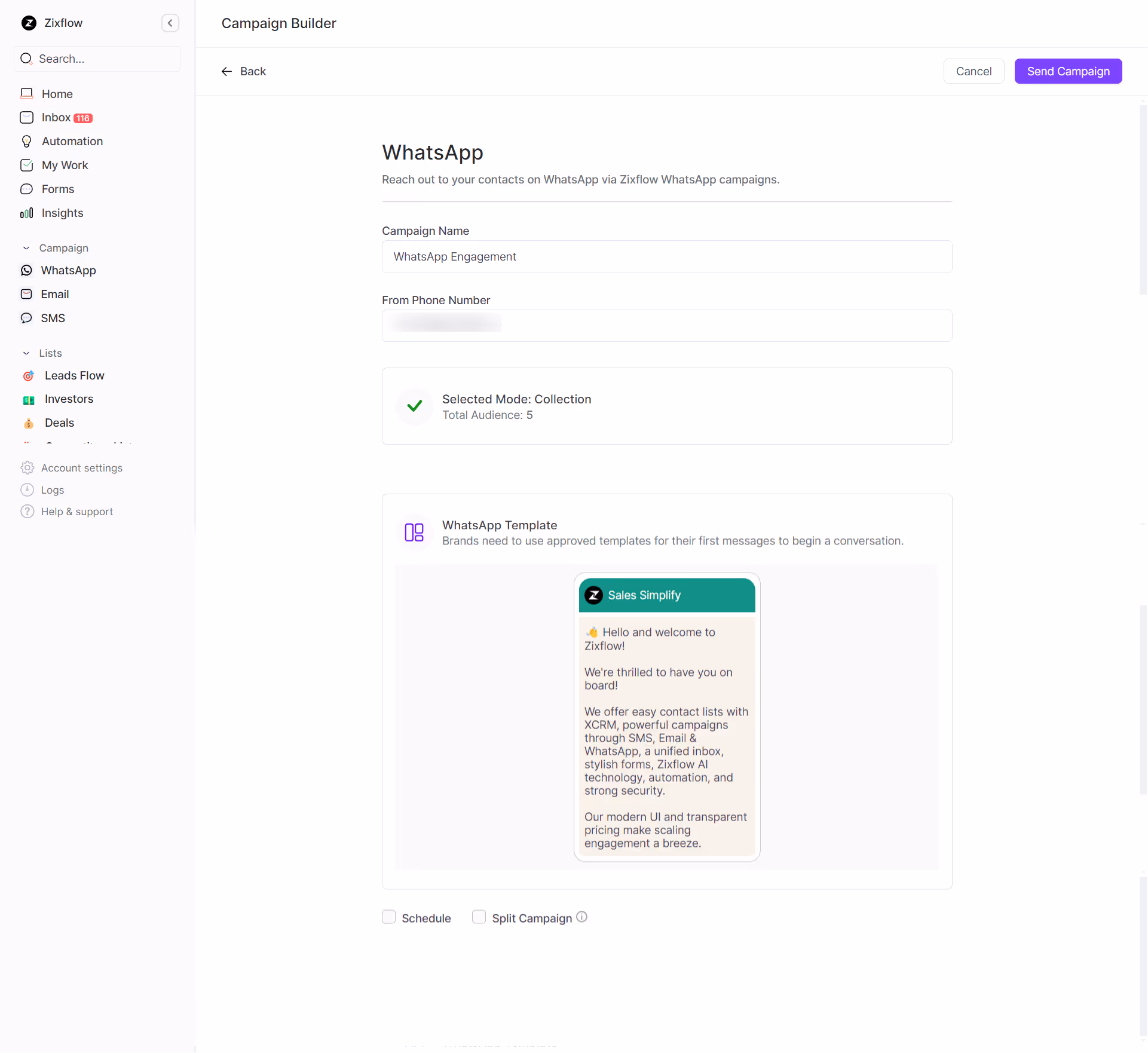 With Zixflow’s WhatsApp Business API, you can simplify your communication by automating tasks, scheduling messages, choosing templates, and sending personalized messages, all from an easy-to-use dashboard. You can tailor your WhatsApp campaigns to suit each contact’s preferences, ensuring your messages are timely and relevant.