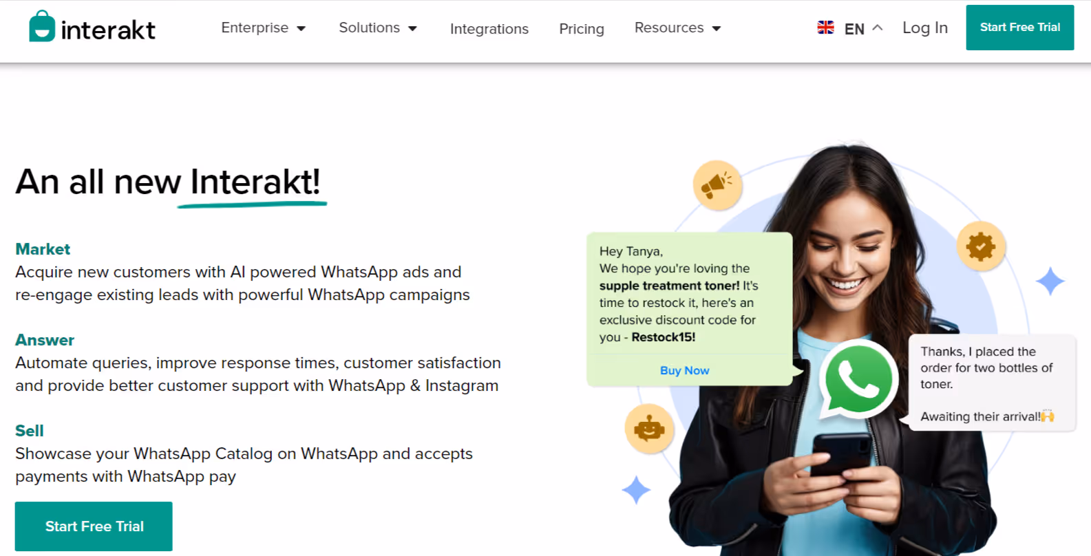 Interakt is your go-to WhatsApp conversational commerce platform. It allows you to connect directly with your customers through popular messaging apps like WhatsApp.