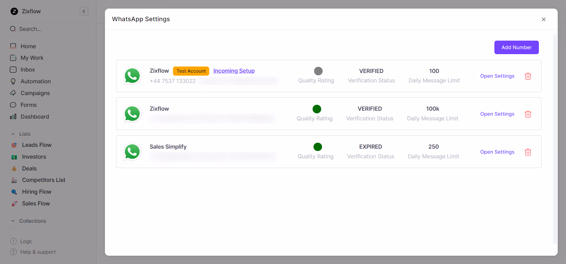 After your account is validated, it will appear in your Zixflow account and its status will say Verified. At this point, you can start using this number to run WhatsApp initiatives using Zixflow.