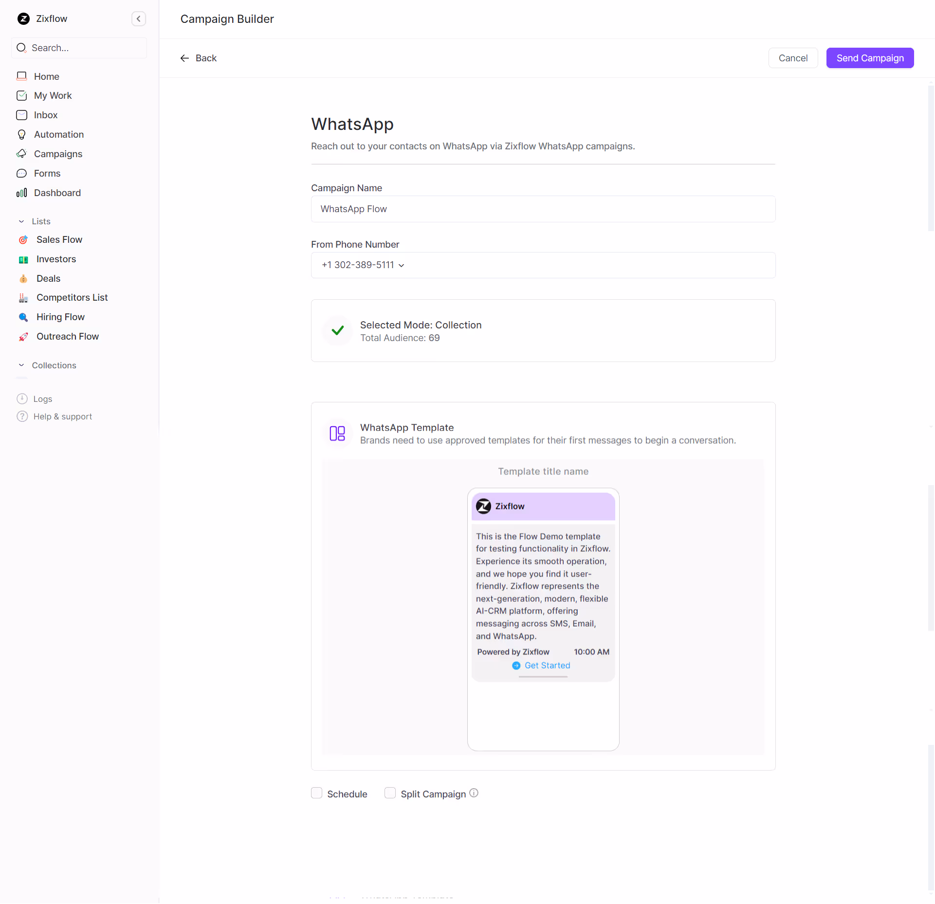 Zixflow’s simple-to-use WhatsApp campaign builder for WhatsApp marketing.