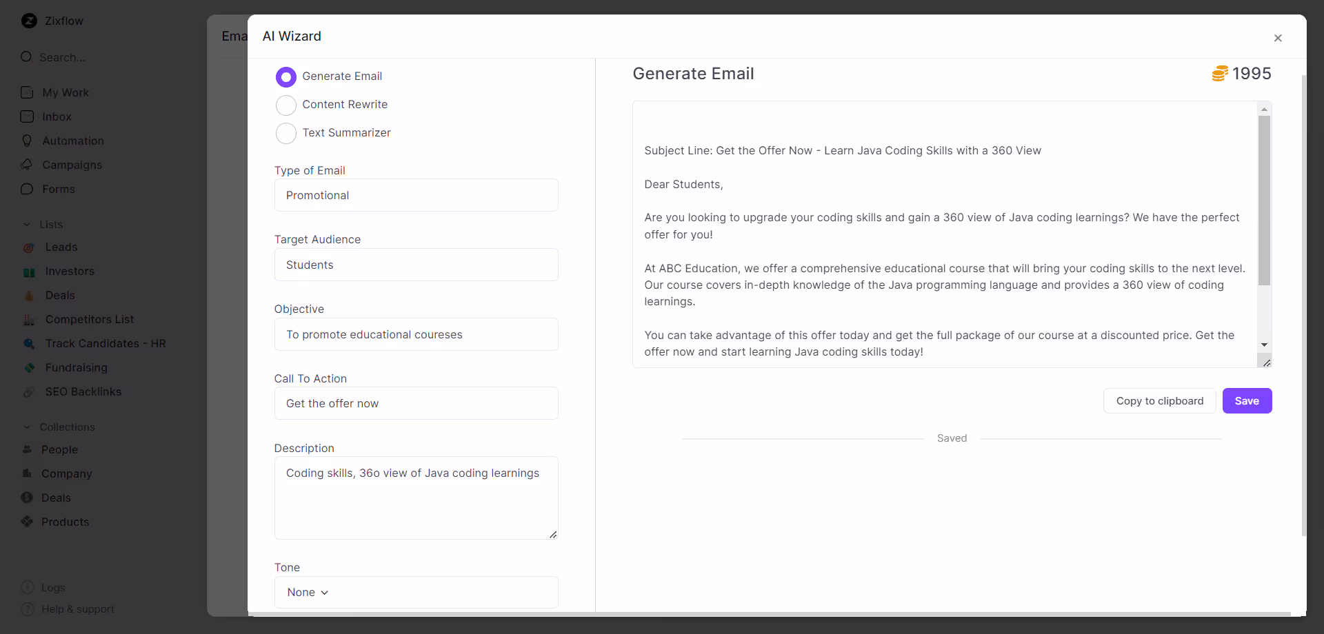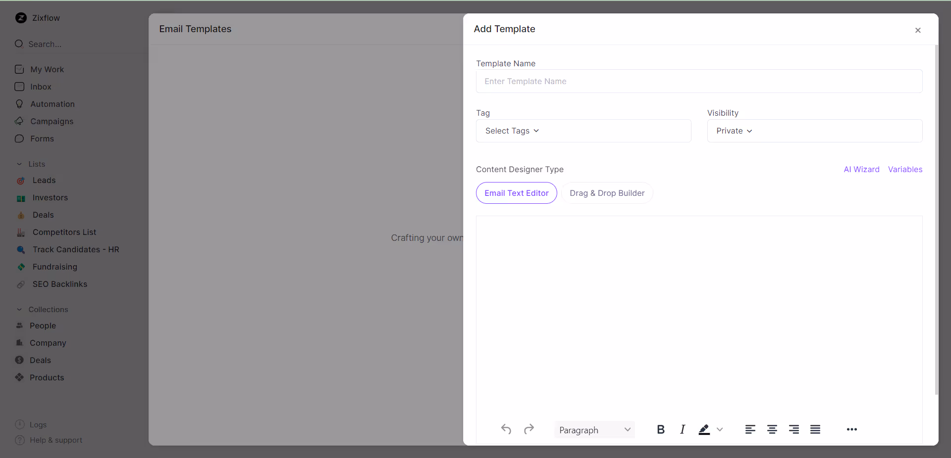 With Zixflow’s email AI wizard, you not only use captivating email templates but also customize them by using an Email text editor or drag-and-drop builder. You can add variables and create tags for your campaign outreach. The most amazing part is that you don’t need to be a pro email writer, as you can generate an email, rewrite it, and summarize the content by using its built-in AI writer.