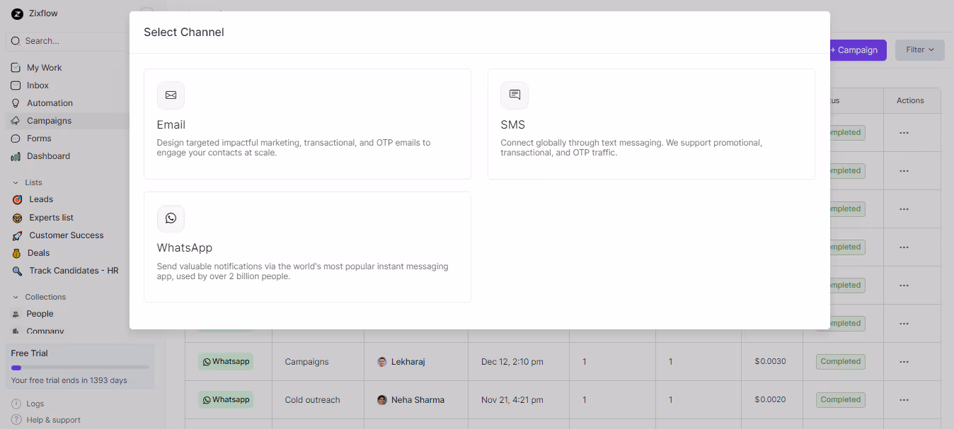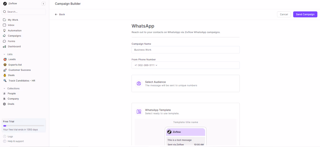 If given the choice, Zixflow would be my top pick among the tools. It's an excellent freemium platform that offers a range of features, including a WhatsApp campaign builder, SMS campaigns, email creation, lead management, deal management, and form building, all conveniently available in one place. It provides a comprehensive solution that aligns with various marketing and business needs.