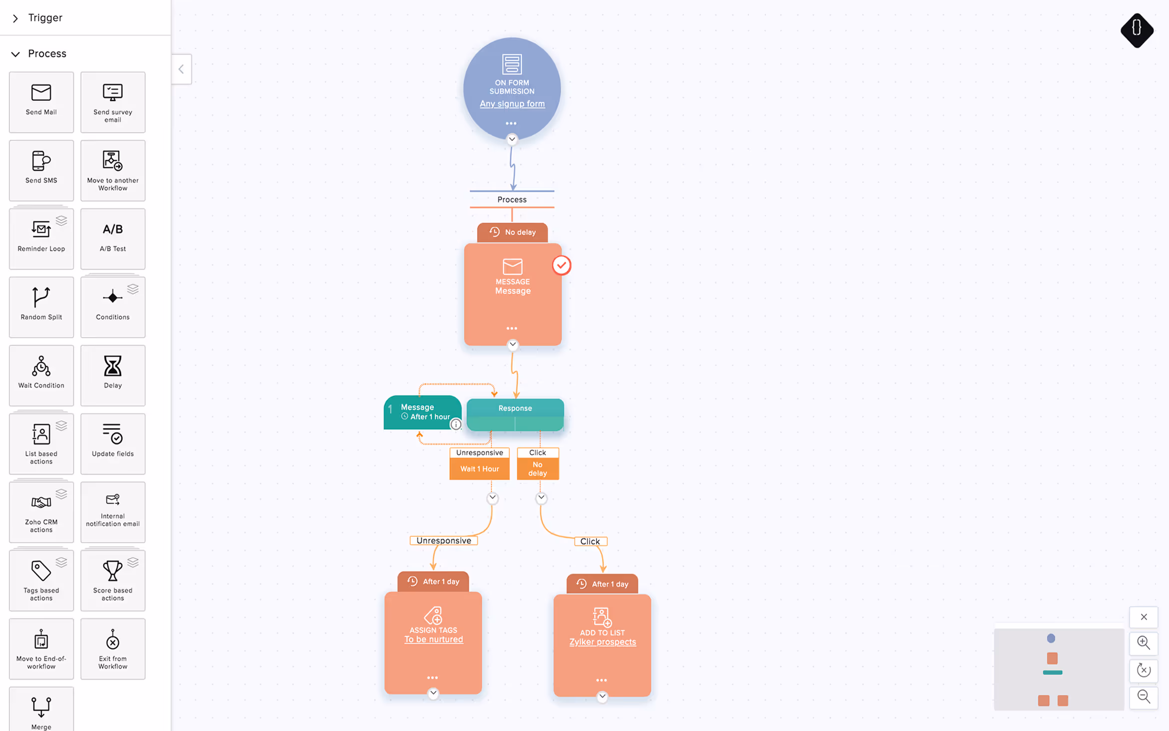 You can use Zoho CRM to make your sales process easier. It can handle tasks like sending follow-up emails and updating fields automatically based on specific rules. It assigns leads to the right salesperson and checks all deals before they move forward.