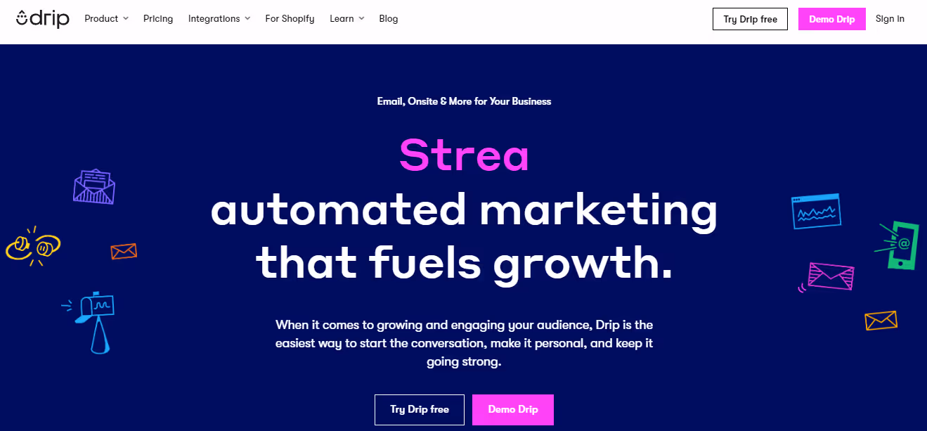 Drip is a popular marketing automation platform specifically designed for e-commerce businesses. It helps you turn casual shoppers into loyal customers by automating personalized marketing campaigns across email, SMS, and onsite popups.