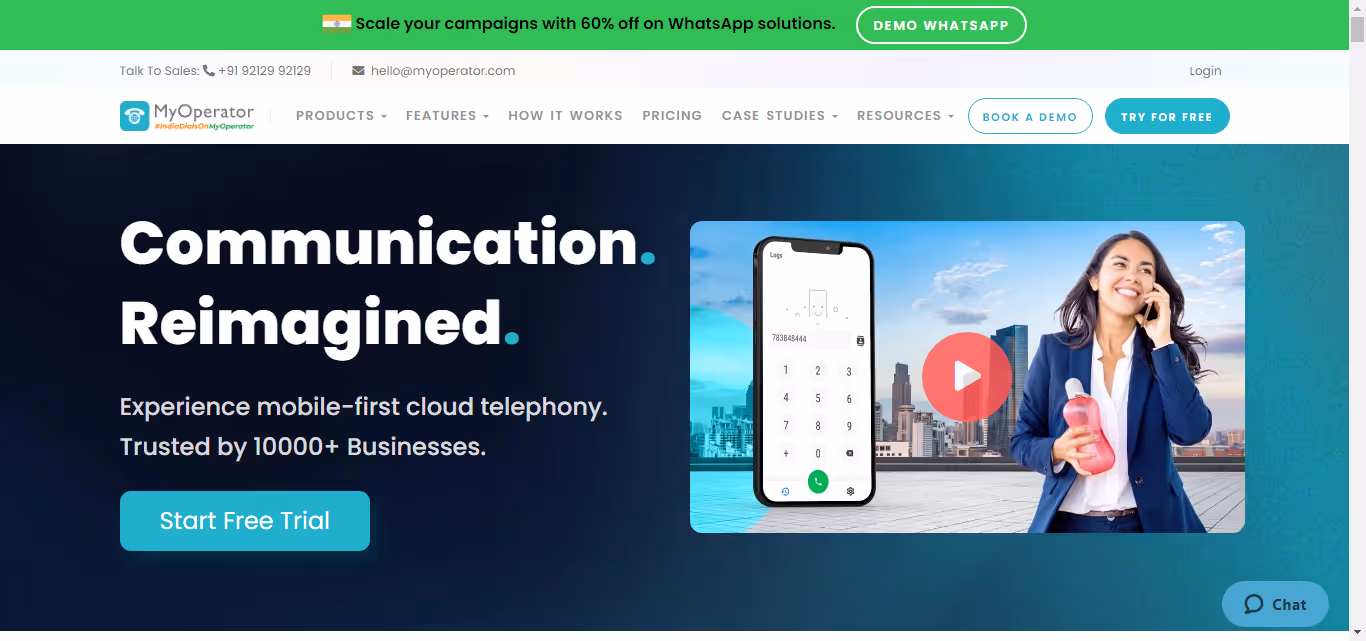MyOperator is a cloud-based business phone system that provides virtual phone numbers for Whatsapp and SMS, IVR (Interactive Voice Response) solutions, call tracking, and call recording for you to engage your customers effectively. On top of that, it also lets you run and manage your marketing campaigns across SMS, calls, and WhatsApp from a single platform.