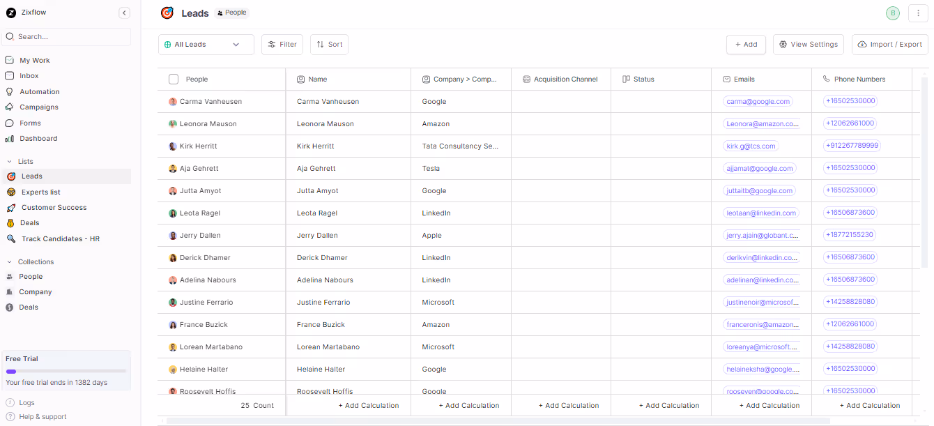Within Zixflow, there's a dedicated section called 'People' where you keep all your customer information. This covers their name, phone number, email, WhatsApp, job title, and company details. The user-friendly dashboard allows you to effortlessly add, edit, share, or delete contact information. Plus, you can quickly filter and organize the list to focus on important clients, depending on what's happening at the moment.