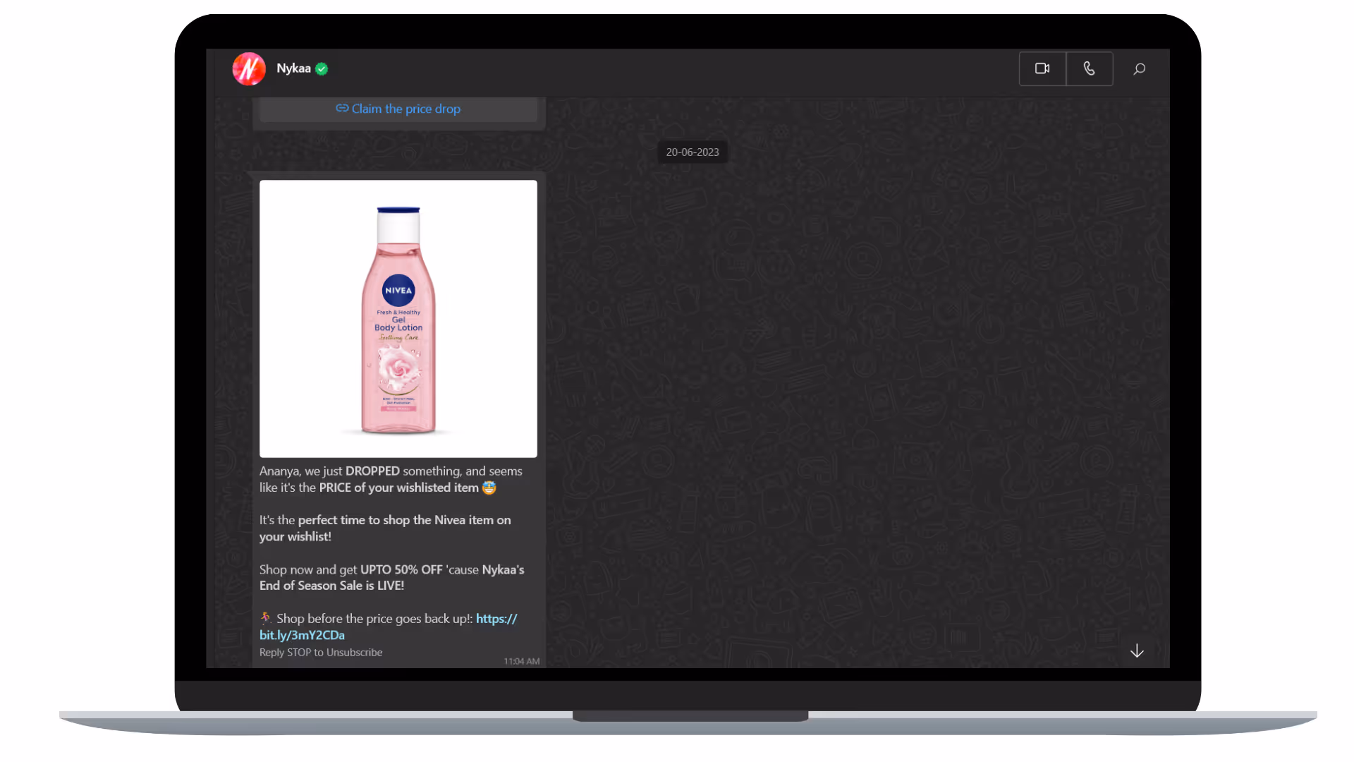 Nykaa is the ideal illustration of a business that completely comprehends the persona of its clients and offers customers enticing WhatsApp messages by carefully studying their most recent picks and decisions.