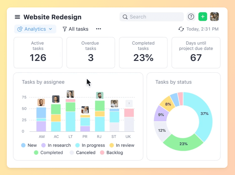 Asana’s visual feature for the project timeline is a Gantt chart of sorts. It indicates your task due dates, assignments, and progress over time. This can give an idea of the progress of your team and help you make changes if there is a deviation in the workflow.