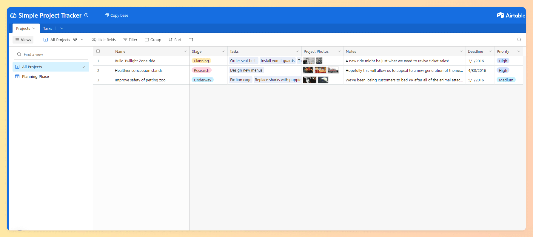 Airtable lets you create tasks, add people to the task, add a due date to the task, and attach the necessary files to the task card with ease. You can then track the progress of the task through the different pipeline views it offers like Gantt view, Kanban view, and table view.