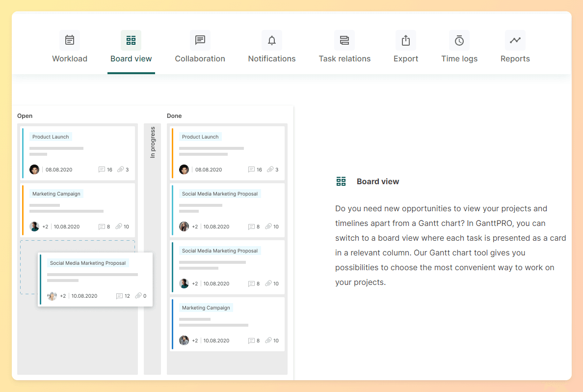 GanttPro allows you to generate detailed reports on your progress with all tasks and export them in the format you want like PDF, XML, Excel, and more. This means you don’t have to spend hours generating reports before a board meeting.