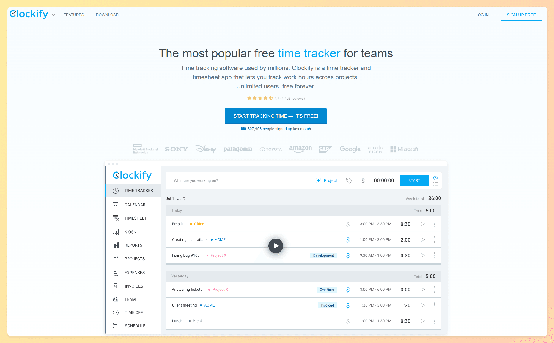 Clockify helps you manage tasks by leveraging the power of time tracking. You can use its timers to track work hours in real time and log these into a Timesheet.