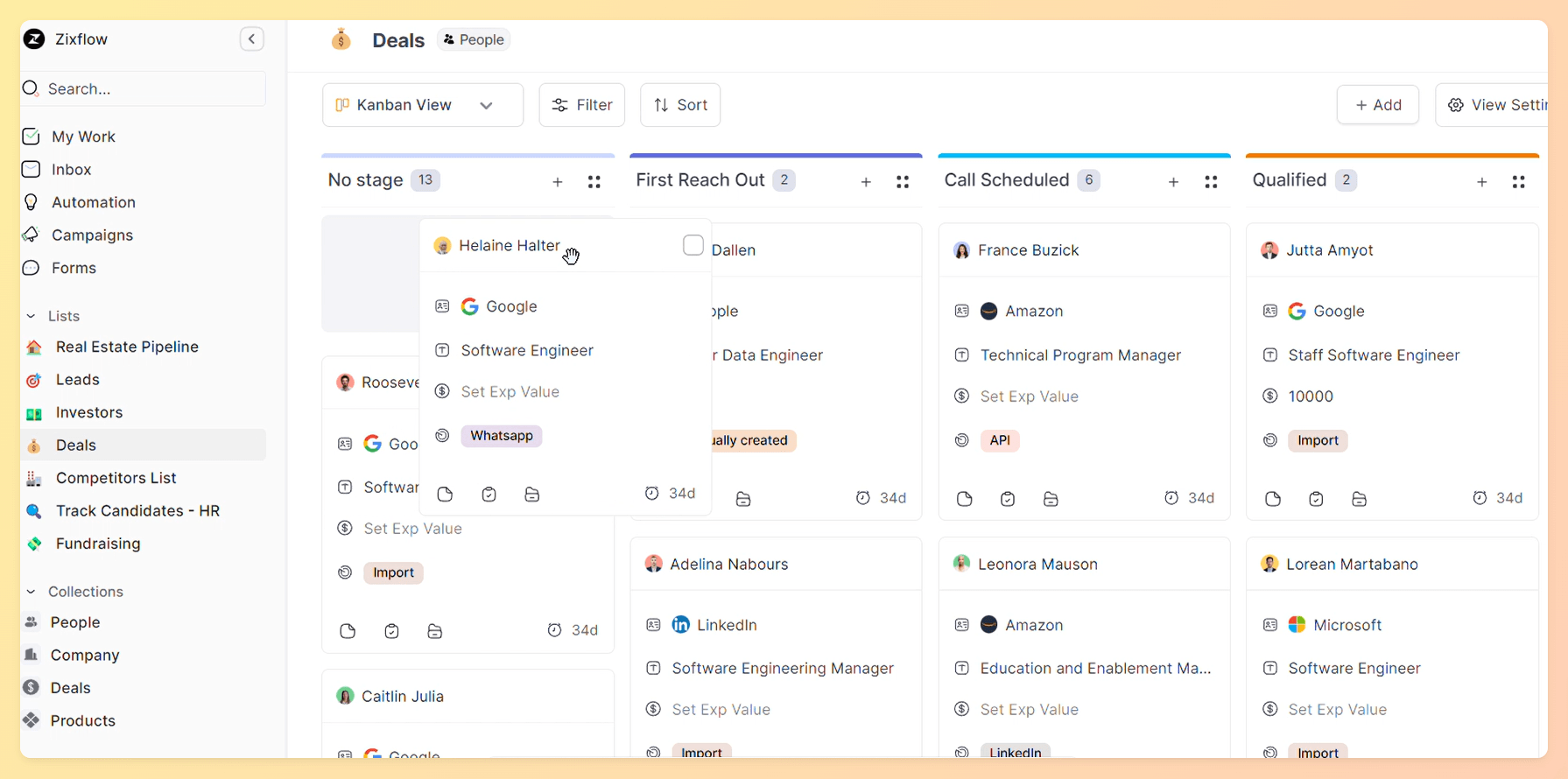 With the easy-to-create visual drag-and-drop pipeline of Zixflow, you can manage all your tasks and projects with ease. You can simply change the view to Kanban view with a single click to create a visual pipeline that helps you manage your tasks and projects on the different stages of the sales pipeline with ease.