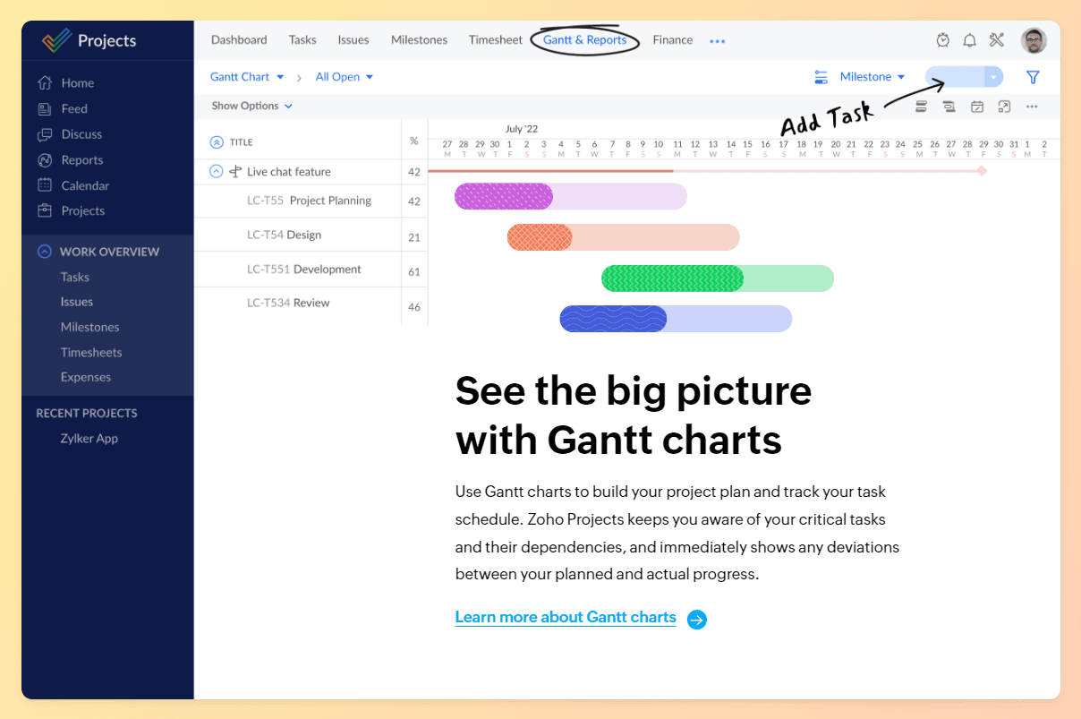 Zoho has a great visual pipeline where you can see the progress of your team. You add tasks and assign them to team members with ease using this tool. It also gives you an idea of the progress as a whole and lets you set milestones along the way to stay on track toward the completion of goals.