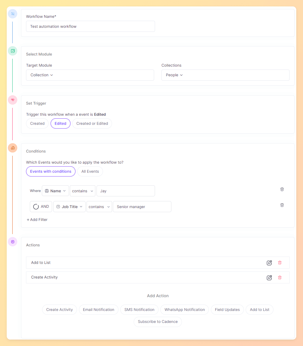 With Zixflow, creating a visual workflow builder with zero coding is a breeze. It's easy to add triggers and conditions to your workflow whenever there is an update in any record.