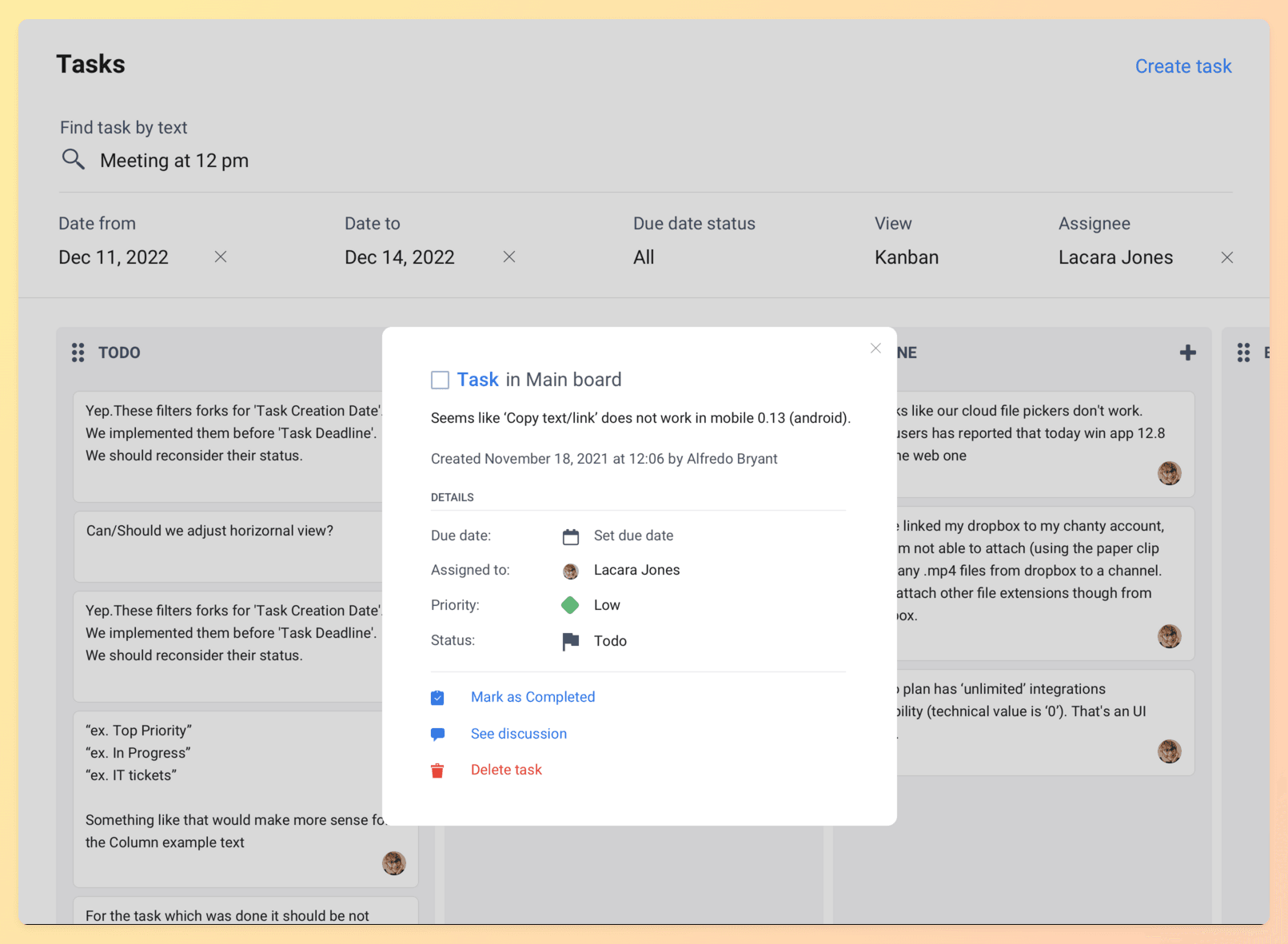 Chanty, a software for task tracking, lets you manage tasks and reach your big-picture goals on time and within budget. It allows you to set a task status as done or undone. You can even re-assign a task to the team member or click on the discuss option to go to a task-related conversation. Also, you can address roadblocks instantly using one-on-one and group video calls.