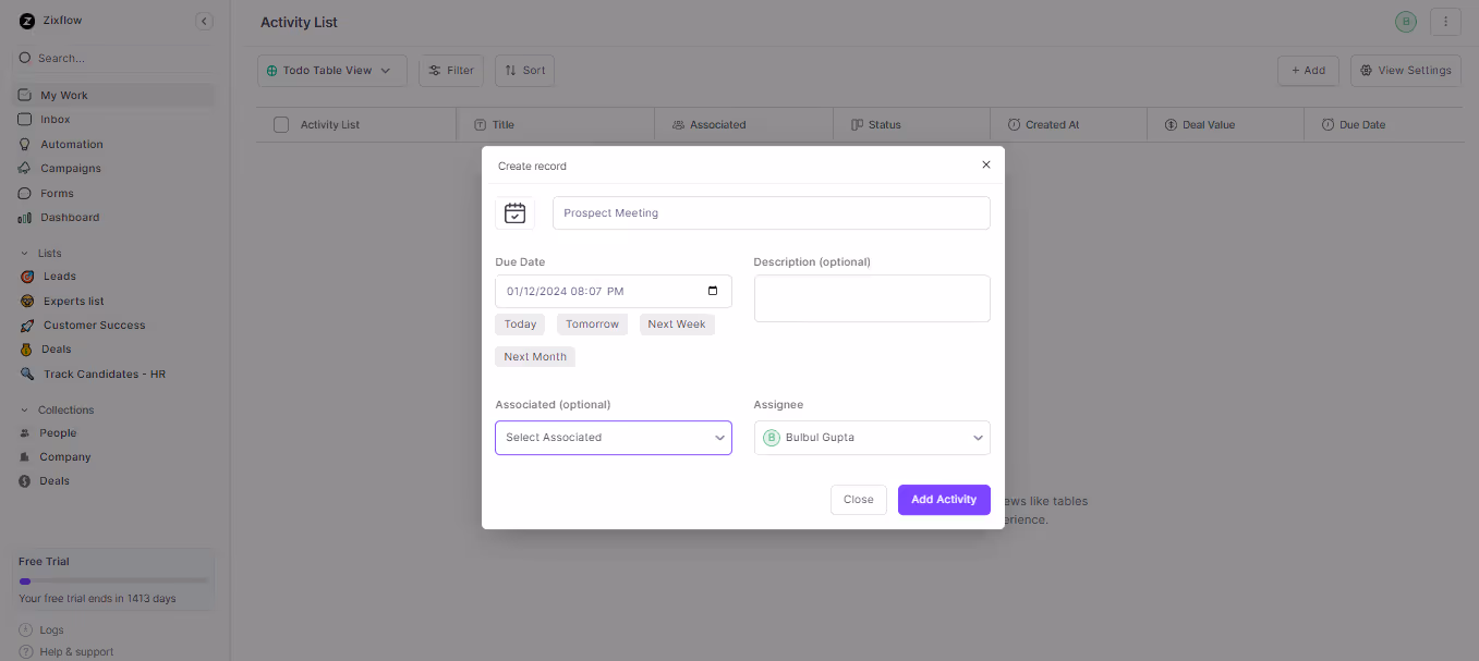 Zixflow's activity list makes it super easy for you to note what happens in your meetings with potential salespeople. You can create neat and organized records that keep track of all the important details, like status, deal values, and things you need to do afterward.