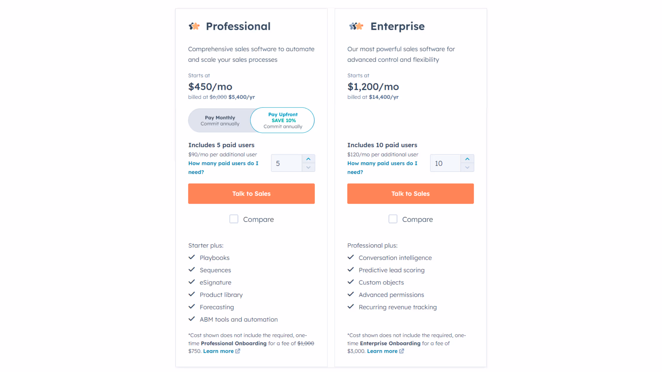 The Professional plan comes with everything included in the free and starter plans, plus features like product library, e-signature, sequences, and forecasting, costing $450 per month.