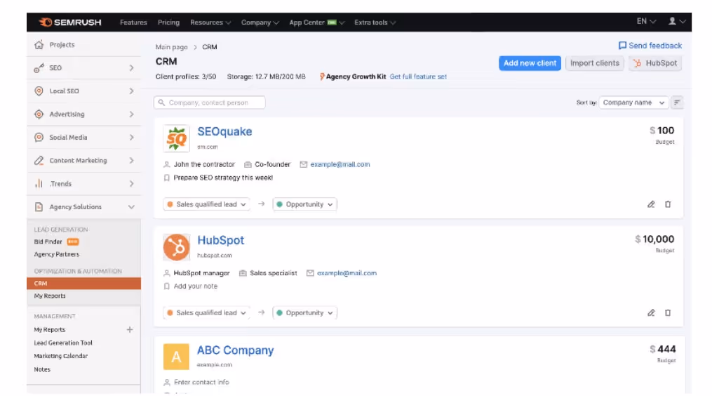 Semrush is a sales CRM software which is designed for digital marketing agencies, freelancers, and consultants who work easily and adeptly with multiple clients.