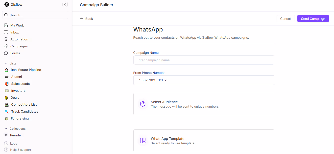 Connect with potential customers by sending personalized messages through WhatsApp to capture leads effectively. Take advantage of Zixflow's WhatsApp campaign builder that allows you to effortlessly send bulk WhatsApp advertising messages so that you can attract more customers.