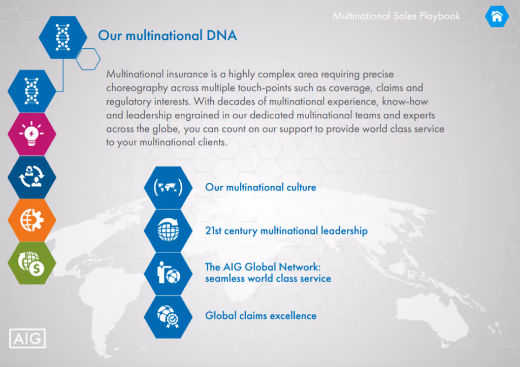 For instance, AIG is a multinational insurance company that offers various insurance types and similar financial solutions. It uses a sales playbook that is eye-catching and breaks the long lines of text using graphics and bullet points so that the sales team can understand the information quickly.