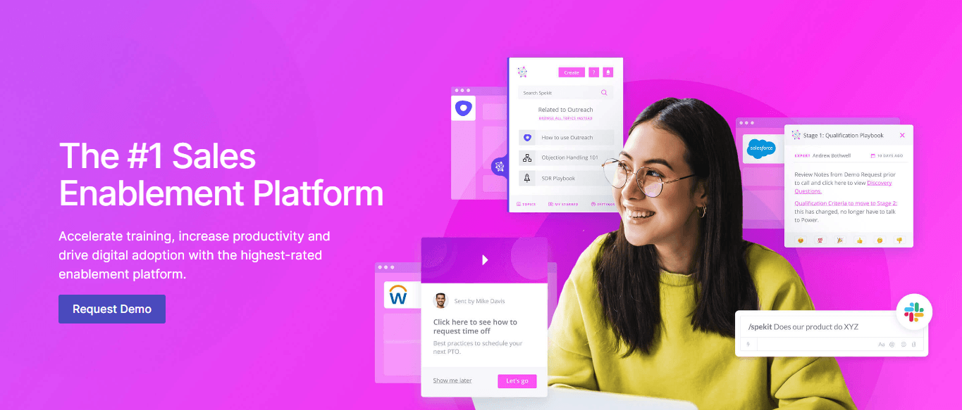 Spekit is a cloud-based digital adoption platform (DAP) that assists in automating your training and documentation process. It provides a unified platform to share knowledge with sales agents, so they can learn the process and operation faster and more efficiently.