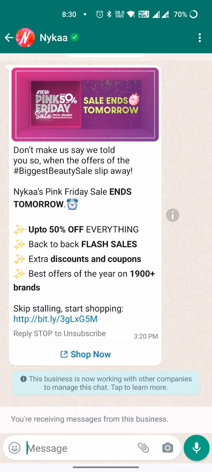 Nykaa is a leading B2C cosmetic marketplace. Starting from onboarding to retention the brand follows a low engagement model, given the volume and pricing of the products. Here are some examples of how they are using email marketing, WhatsApp marketing, and SMS marketing for their brand’s sales engagements: