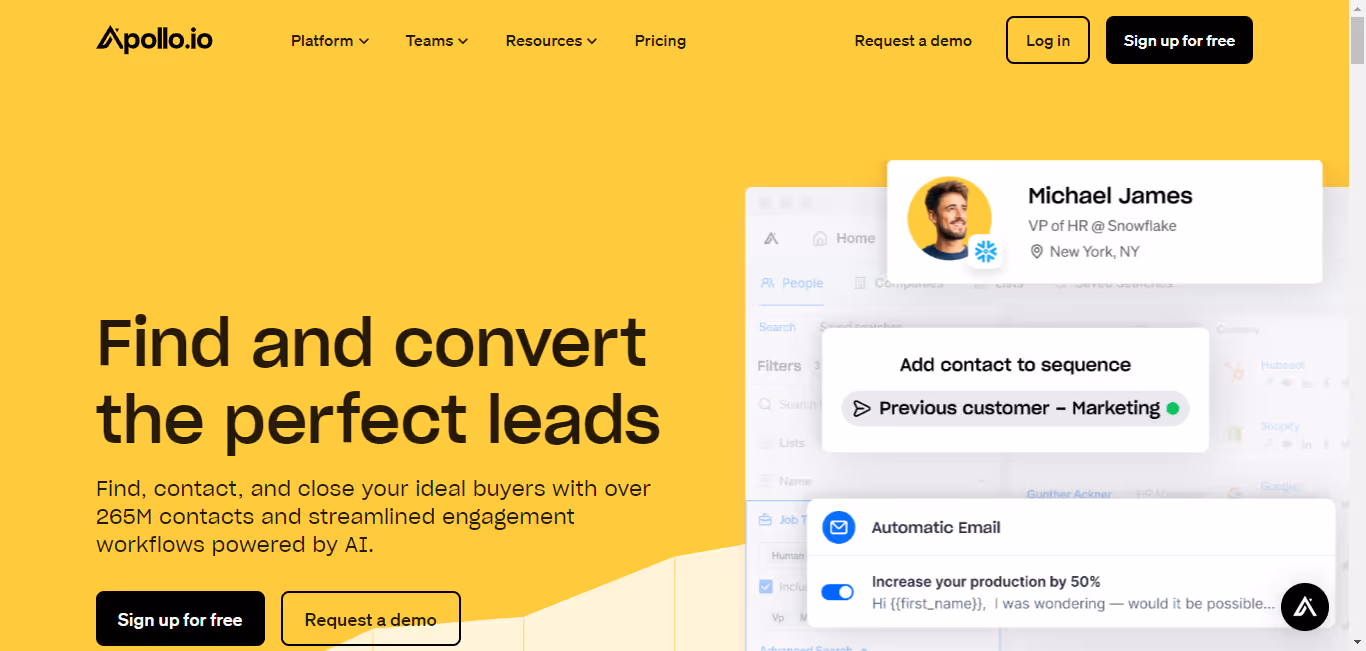 Apollo.io is a sales intelligence suite that allows you to identify, reach out, and convert leads into customers. Your sales reps can take advantage of Apollo’s Engagement tools to expand your company’s presence using outbound sales strategies.