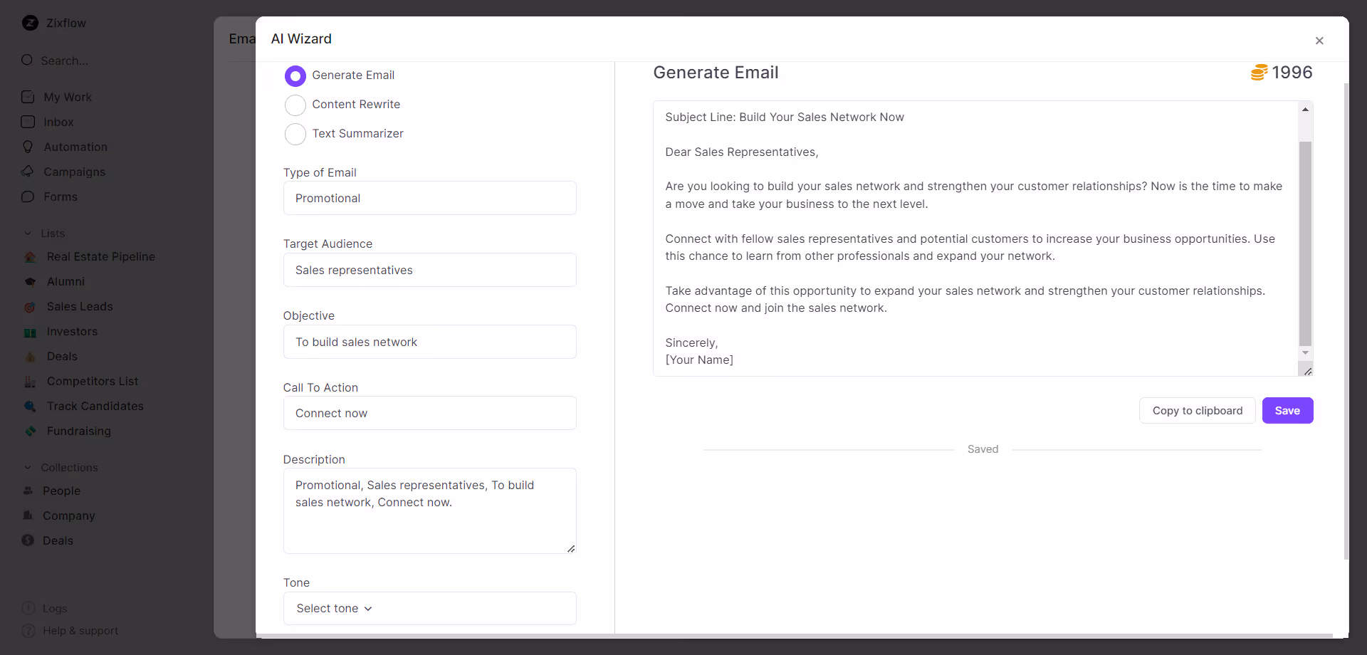 To automate your follow-up process, utilize the email marketing tool Zixflow. With Zixflow you can set your cost-effective email campaigns while accessing data of your buyers’ journey to your sales history. There you can autogenerate, rewrite, or summarize the content with a built-in AI writer by giving certain instructions and sending the content with captivating customized email templates.