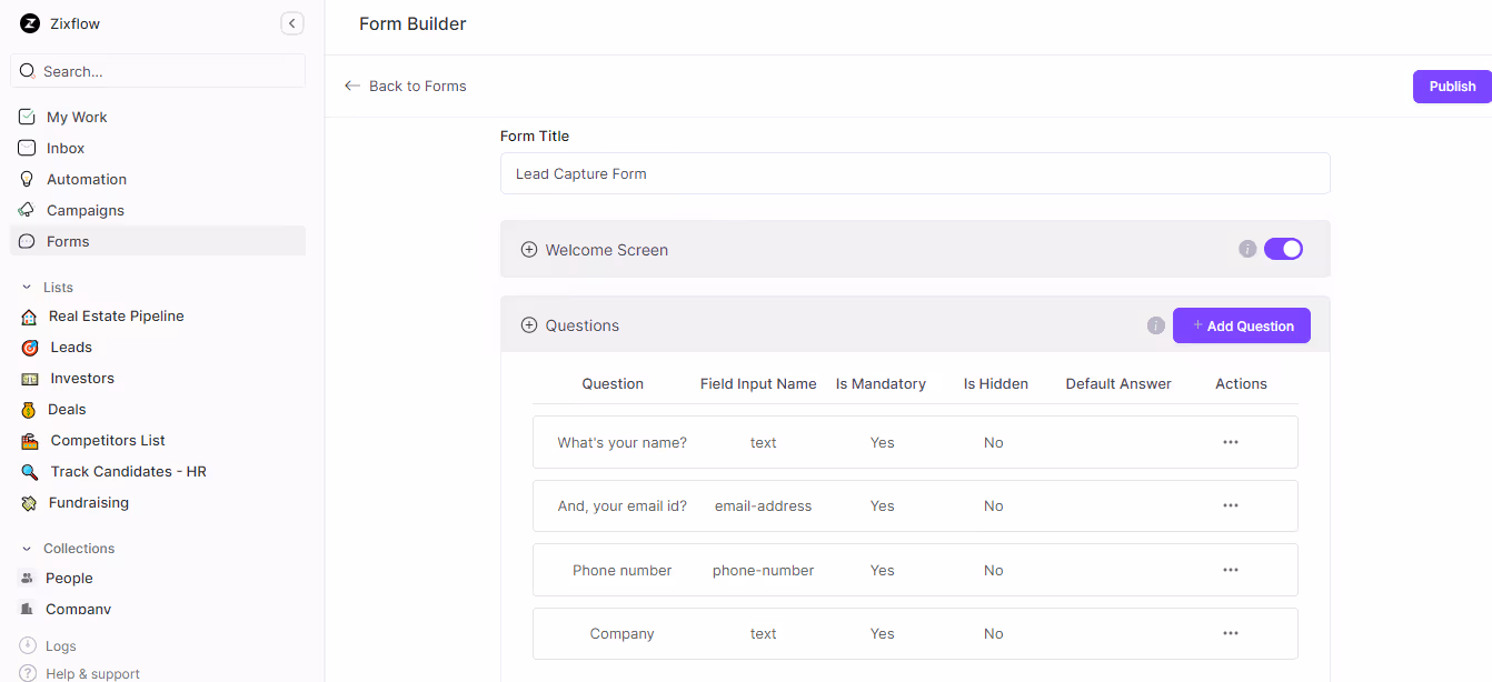 With Zixflow form builder you can create a form and capture leads by providing a structured and organized way to collect information about potential customers. These forms have fields for essential information such as name, email address, phone number, and company.